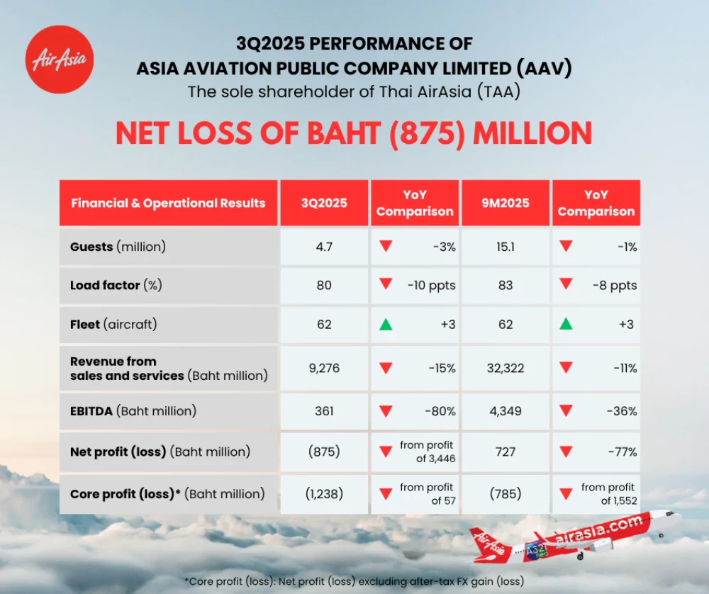 Bangkok, 13 November 2025 – Asia Aviation Public Company Limited (“AAV”), major shareholder of Thai AirAsia (“TAA”), today announced its financial results for the third quarter of 2025 with revenue from sales and services of THB 9,276 million, down 15% year-on-year (“YoY”), mainly due to a 3% decline in passengers carried, 12% lower average fare to THB 1,633, and the effect of the low travel season in the aviation industry.