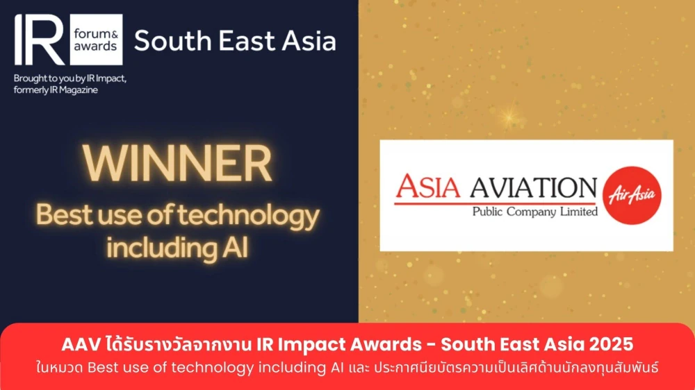 หน้าหลักนักลงทุนสัมพันธ์ เรียนรู้เกี่ยวกับนักลงทุน AAV Highlights ผู้นำตลาด สายการบินราคาประหยัดอันดับหนึ่งในประเทศไทย พร้อมส่วนแบ่งตลาดภายในประเทศสูงสุดอย่างต่อเนื่อง และมีฝูงบินลำตัวแคบที่ใหญ่ที่สุด ด้วยการให้บริการที่ครอบคลุมทั้งท่าอากาศยานดอนเมือง (DMK) และท่าอากาศยานสุวรรณภูมิ (BKK) ทำให้สายการบินสามารถมอบความสะดวกสบายสูงสุด เชื่อมต่อผู้โดยสารระยะไกลได้อย่างไร้รอยต่อ และตอกย้ำสถานะความเป็นผู้นำในตลาดภายในประเทศอย่างแข็งแกร่ง ความได้เปรียบเชิงกลยุทธ์ สามารถใช้ประโยชน์จากเครือข่ายการบินที่กว้างขวางของกลุ่มแอร์เอเชีย ความเชี่ยวชาญด้านการบริหารจัดการ รวมทั้งการจัดหา/บริหารเครื่องบินที่มีความได้เปรียบด้านต้นทุน การเติบโตในอนาคต พร้อมเติบโตในฐานะสายการบินต้นทุนต่ำที่สามารถขยายเส้นทางบินไปทั่วโลก จากการใช้เครื่องบินพิสัยไกลรุ่นใหม่ ความแข็งแกร่งของแบรนด์ มีแบรนด์ที่แข็งแกร่งและเป็นที่รู้จักในตลาด หนุนด้วยอัตราการบินที่มีความตรงต่อเวลาดีที่สุดในอุตสาหกรรม อันดับเครดิต อันดับความน่าเชื่อถือ (TRIS) ปรับขึ้นเป็น "BBB-" ตามแนวโน้มการท่องเที่ยวที่แข็งแกร่ง ข้อมูลสำคัญทางการเงิน 9 เดือนปี 2568 ดูทั้งหมด สินทรัพย์รวม ล้านบาท รายได้รวม ล้านบาท กำไรสุทธิ ล้านบาท ดูทั้งหมด ลงทุนกับ AAV เอกสารที่น่าสนใจ เอกสารเพื่อนักลงทุน เอกสารนำเสนอไตรมาส 3 ปี 2568 แบบ 56-1 One Report ปี 2567 งบการเงิน ไตรมาสที่ 3 ปี 2568 คำอธิบายและการวิเคราะห์ของฝ่ายจัดการ ไตรมาสที่ 3 ปี 2568 สถิติการดำเนินงานที่สำคัญ ไตรมาสที่ 3 ปี 2568 เอกสารเพื่อนักลงทุน ข่าวแจ้งตลาดหลักทรัพย์ 17 พฤศจิกายน 2568 แจ้งวันหยุดทำการประจำปี 2569 12 พฤศจิกายน 2568 คำอธิบายและวิเคราะห์ของฝ่ายจัดการ ไตรมาสที่ 3 สิ้นสุดวันที่ 30 ก.ย. 2568 12 พฤศจิกายน 2568 สรุปผลการดำเนินงานของ บจ. ไตรมาสที่ 3 (F45) (สอบทานแล้ว) 12 พฤศจิกายน 2568 งบการเงิน ไตรมาสที่ 3/2568 (สอบทานแล้ว) 12 พฤศจิกายน 2568 แจ้งกรรมการลาออกและแต่งตั้งกรรมการใหม่ 31 ตุลาคม 2568 การเสนอวาระการประชุมสามัญผู้ถือหุ้นประจำปี 2569 และเสนอชื่อบุคคลเพื่อพิจารณาคัดเลือกเป็นกรรมการบริษัท ดูทั้งหมด ความคิดเห็นนักวิเคราะห์ ณ วันที่ 13 พฤศจิกายน 2568 สรุปข้อมูลบริษัท ไตรมาสที่ 3 ปี 2568 กิจกรรมนักลงทุน สมัครรับข่าวสาร ติดต่อนักลงทุนสัมพันธ์ Flying A Greener Tomorrow E สิ่งแวดล้อม ไทยแอร์เอเชีย ตั้งเป้าหมายการปล่อยคาร์บอนสุทธิเป็นศูนย์ภายในปี 2593 ผ่าน 4 แนวทางและมาตรการเพิ่มเติมที่กำหนดไว้ในนโยบายด้านสิ่งแวดล้อม โดยมุ่งเน้นการลดการปล่อยก๊าซเรือนกระจก การใช้พลังงาน การจัดการน้ำและของเสีย อย่างมีประสิทธ